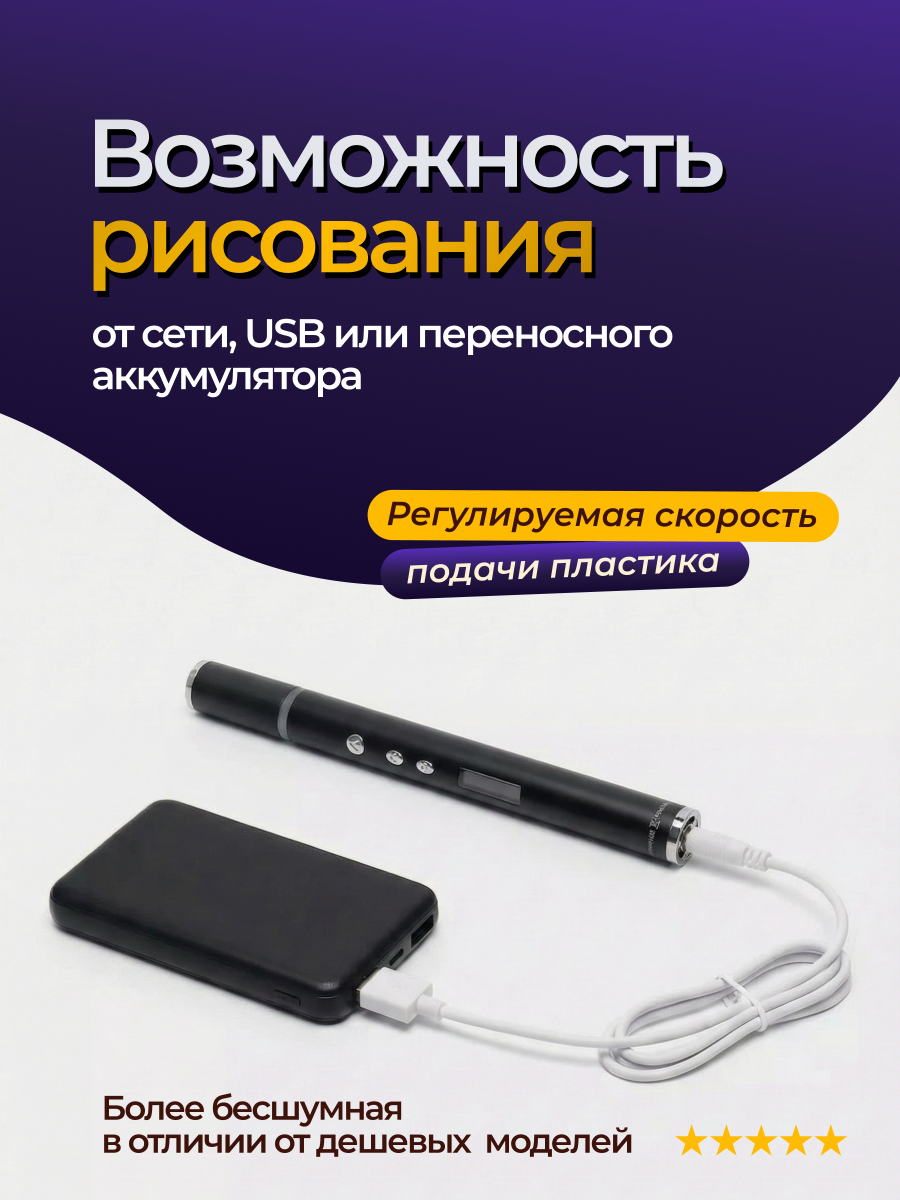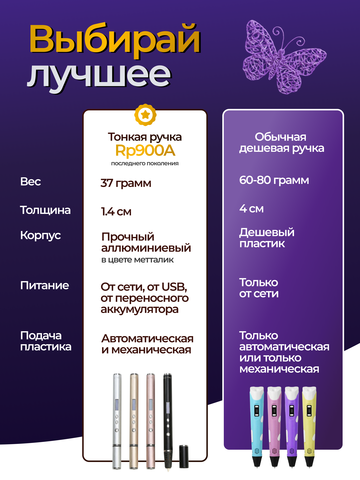 Вес, который практически не чувствуется во время работы, а также удобное управление - отличительные особенности RP900A, которыми не может похвастаться другая модель 3Д ручки. Кроме того, RP900A имеет возможность работы от USB, а значит вы можете подключить Power Bank (переносной аккумулятор) и не быть привязанными к розетке.