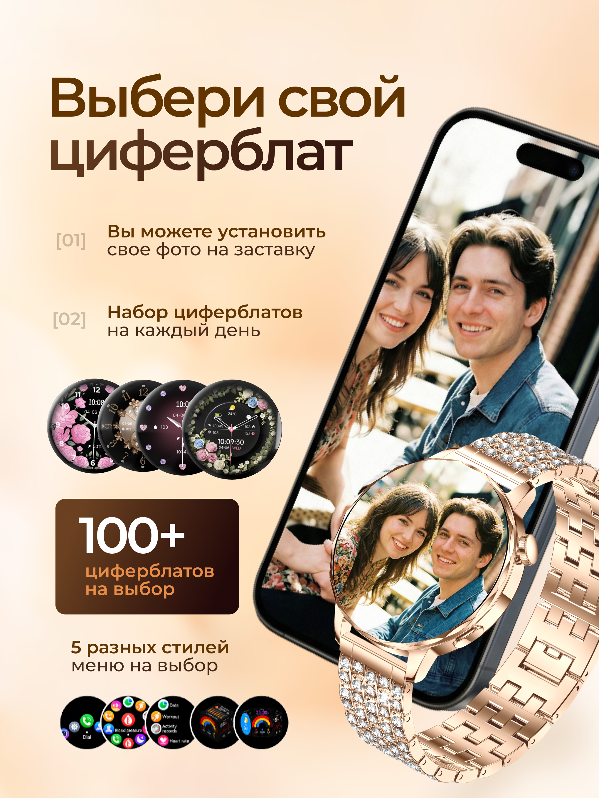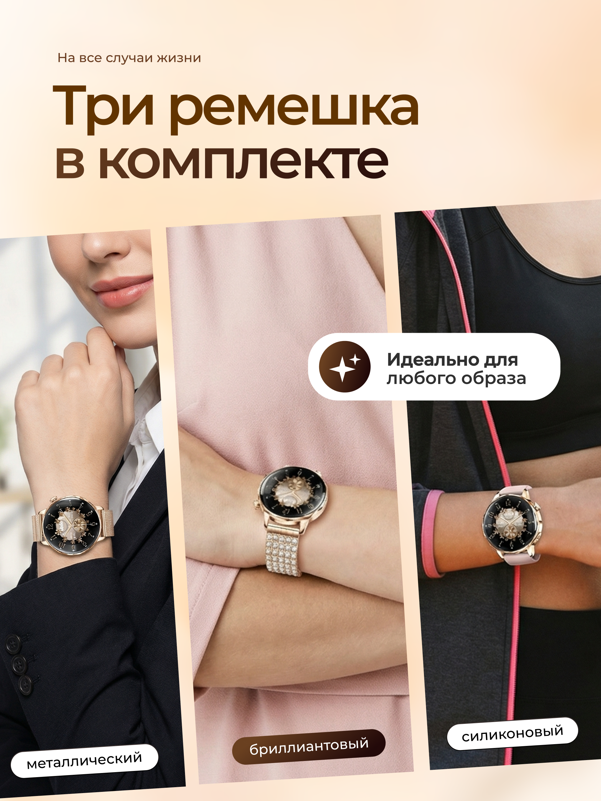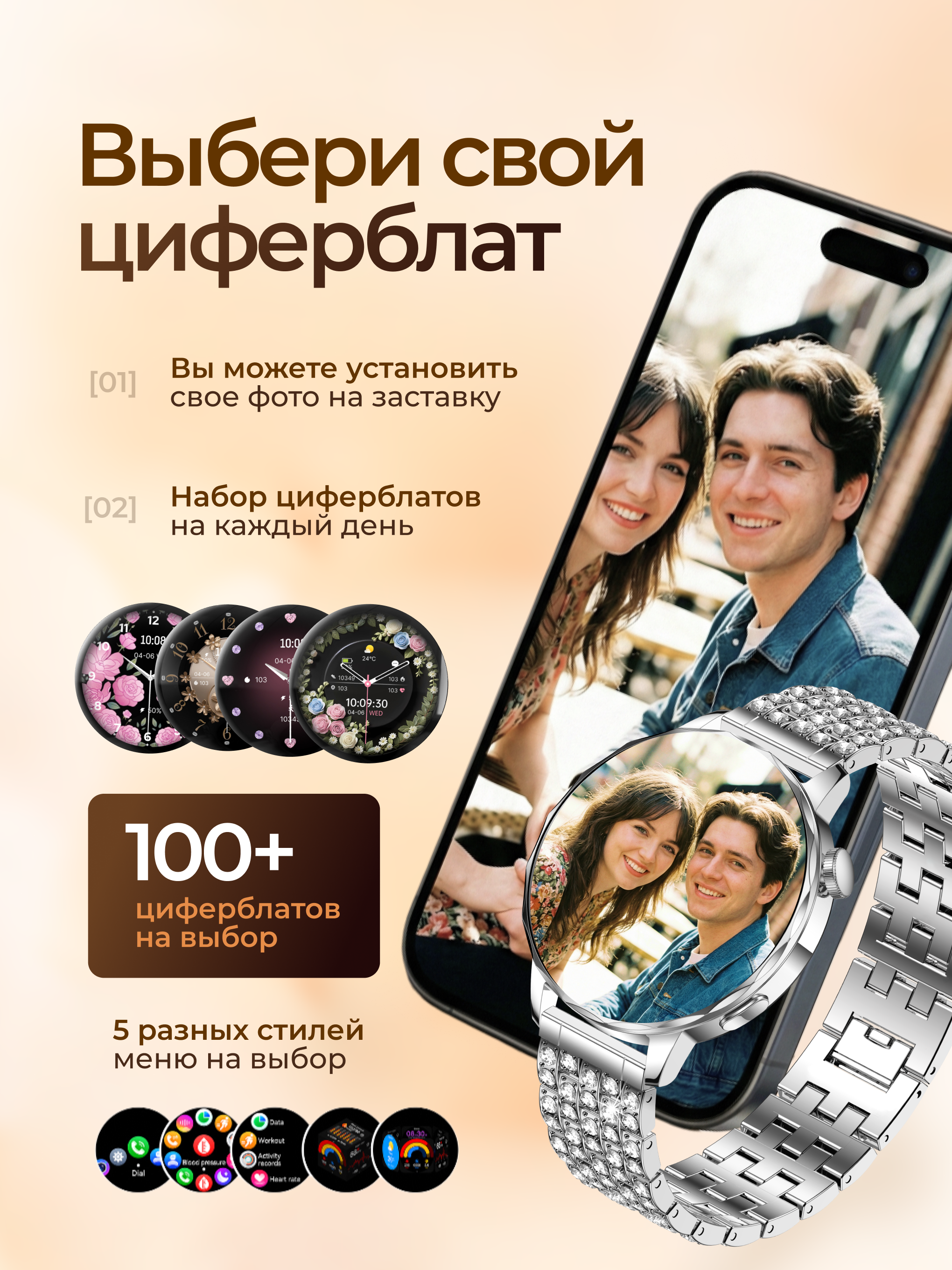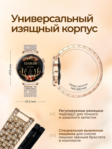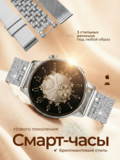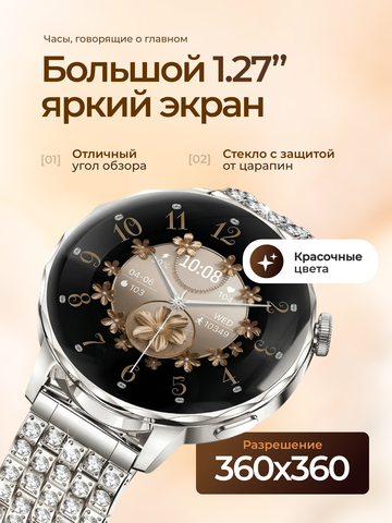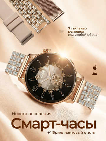 Наручные женские смарт-часы- новинка 2026 года, которые всегда в гармонии с вашим настроением. Эксклюзивная серия I-Crystal - аксессуар с классическим круглым дисплеем с Bluetooth звонком, влагозащитой и тремя дизайнеркими ремешками. Выберите свой стиль дня - регулируемый браслет с инкрустацией бриллиантовыми стразами для особых случаев, металлический плетеный ремешок для офисных образов или силиконовый ремень для спорта.