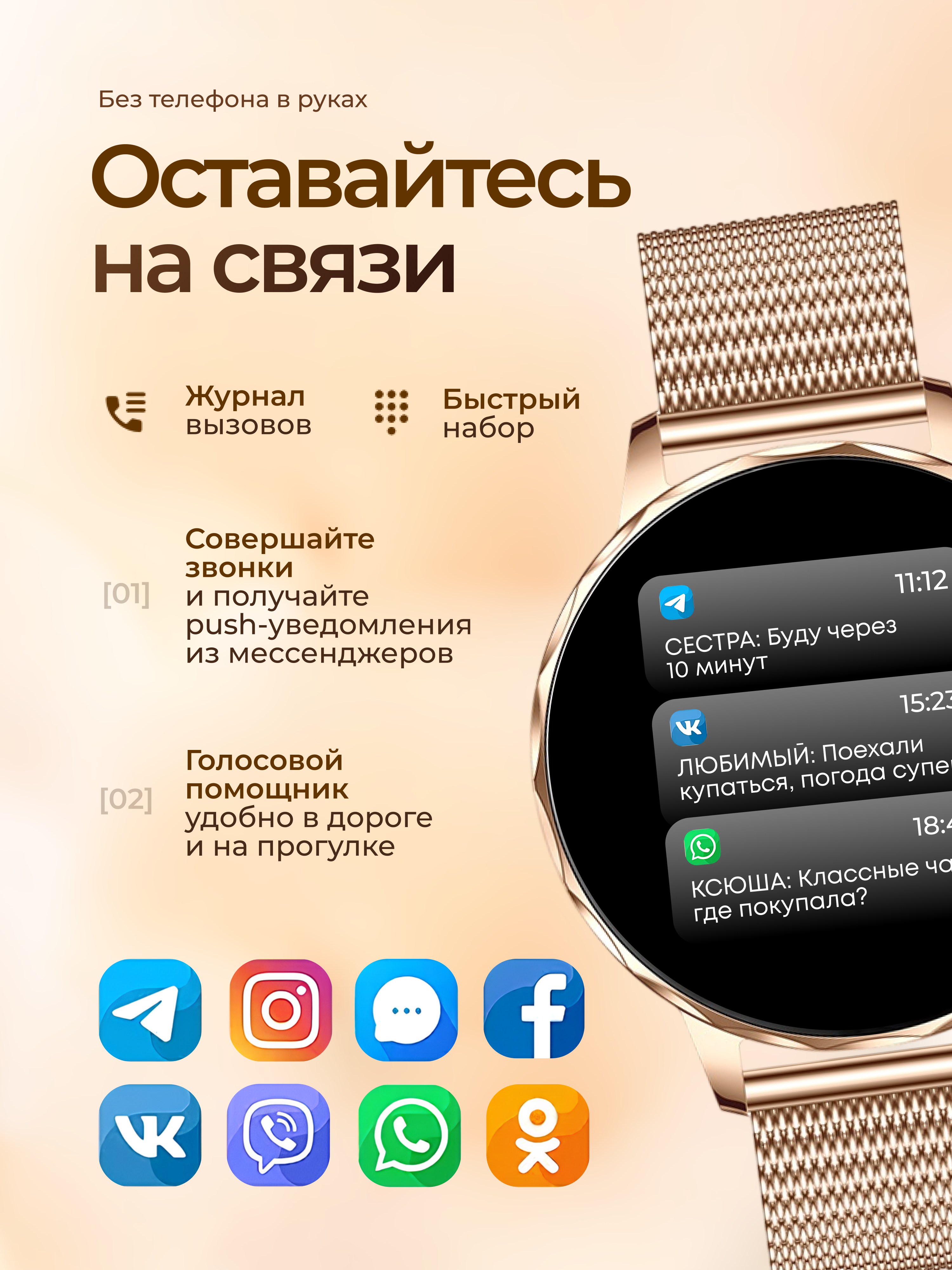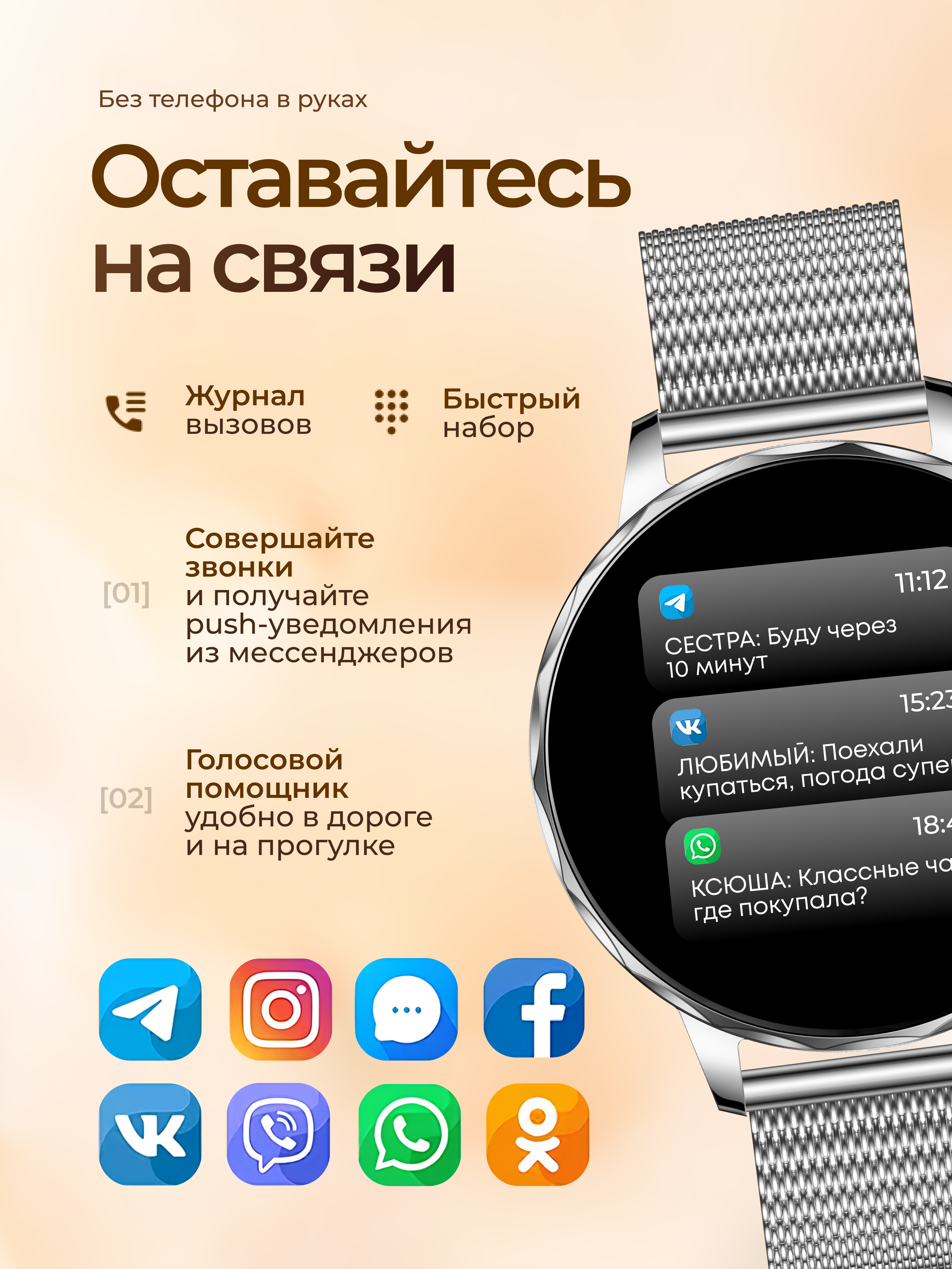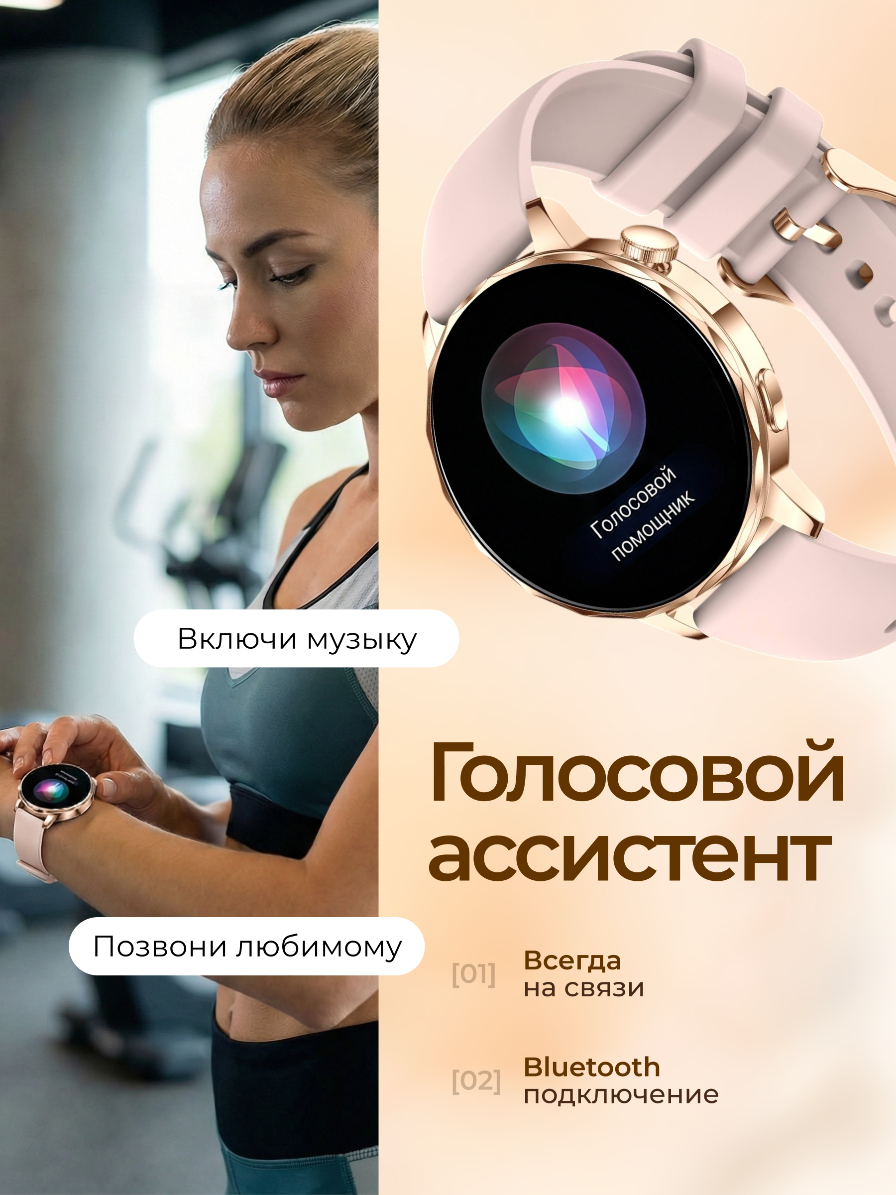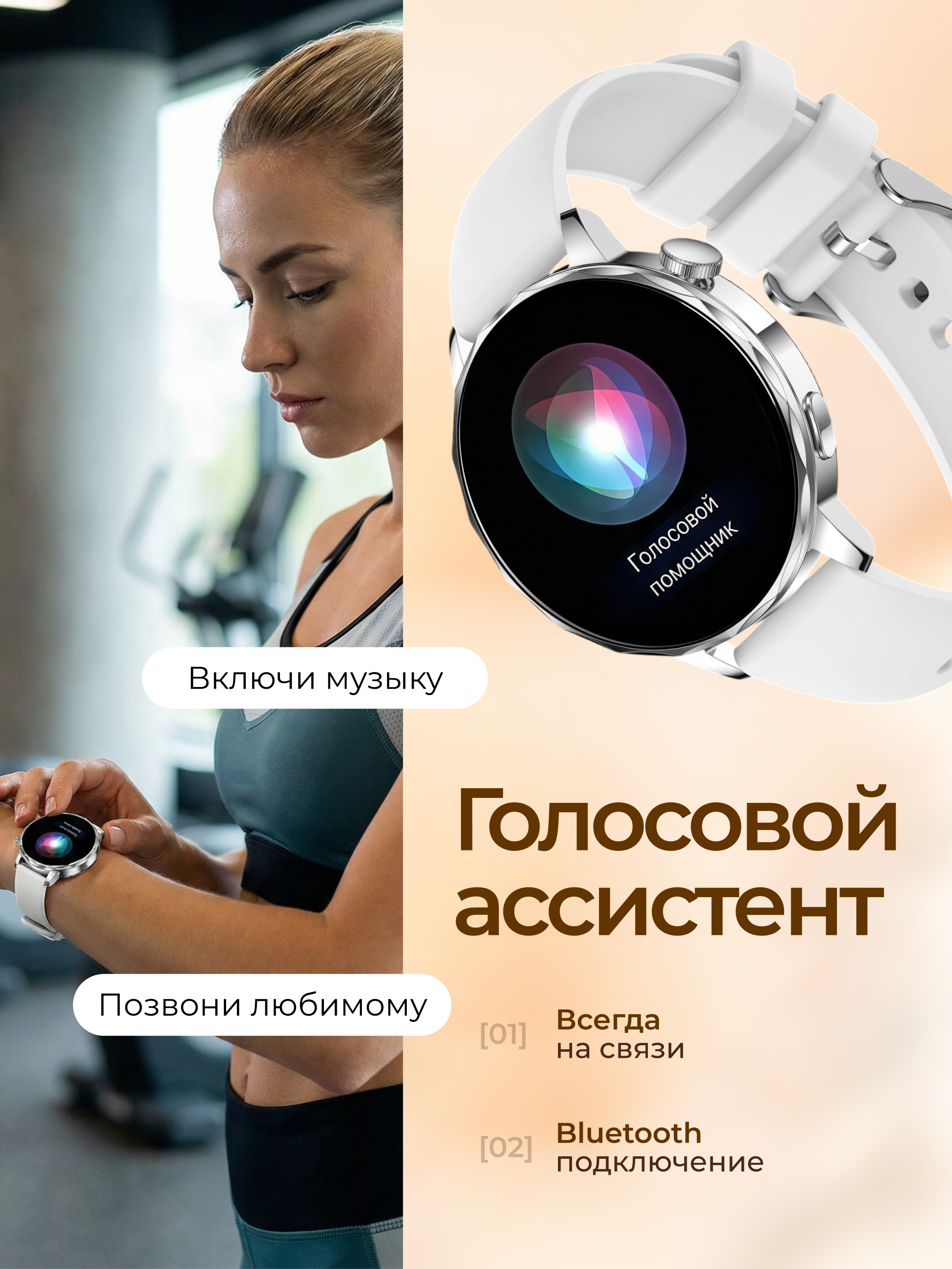 Умные часы подходят для андроид и айфон (IOS) смартфонов и обеспечивают уверенное соединение без разрывов и высококонтрастное яркое изображение на дисплее с широкими углами обзора. Другие особенности функционала: отображение уведомлений, сообщений из мессенджеров и приложений и опция разговора и приема звонков прямо через часы, когда смартфон где-то в кармане или сумочке. Новая особенность серии - интегрированный голосовой ассистент для быстрого управления смартфоном. Распознает речь, включает музыку в аудиоплеере телефона, звонит близким за вас.