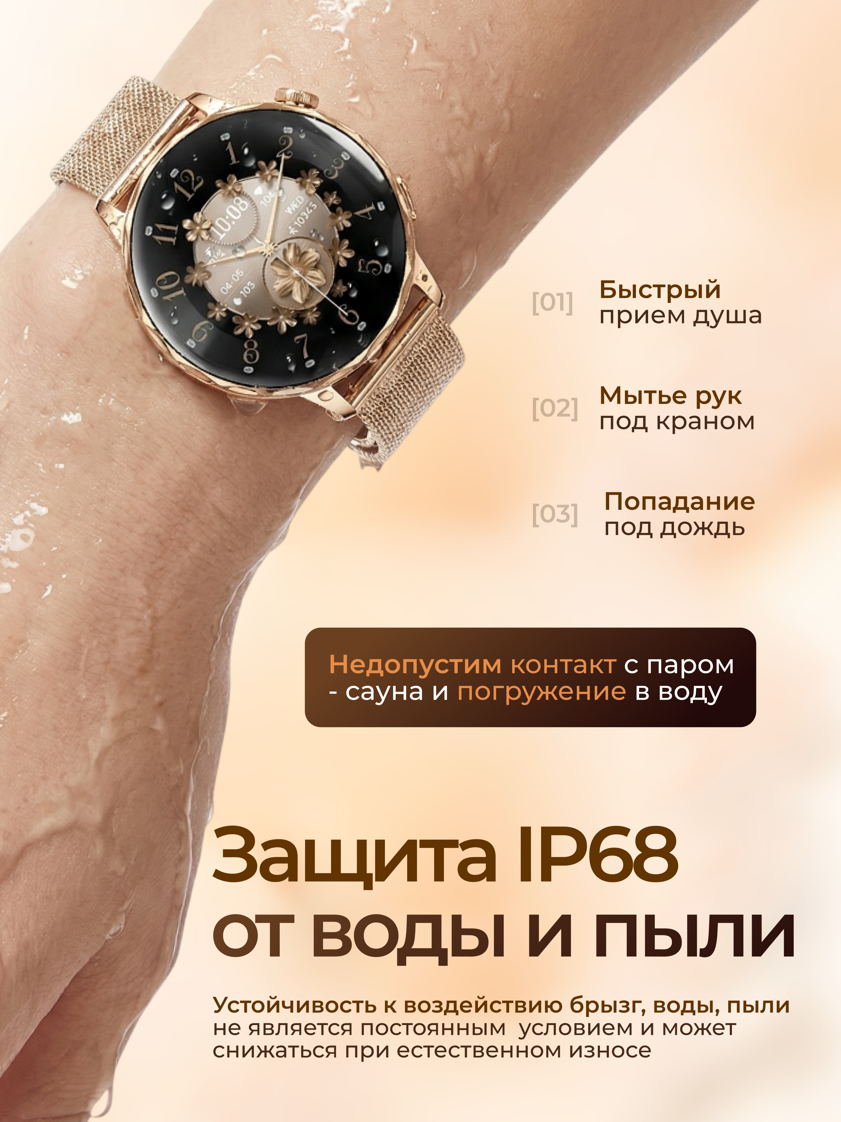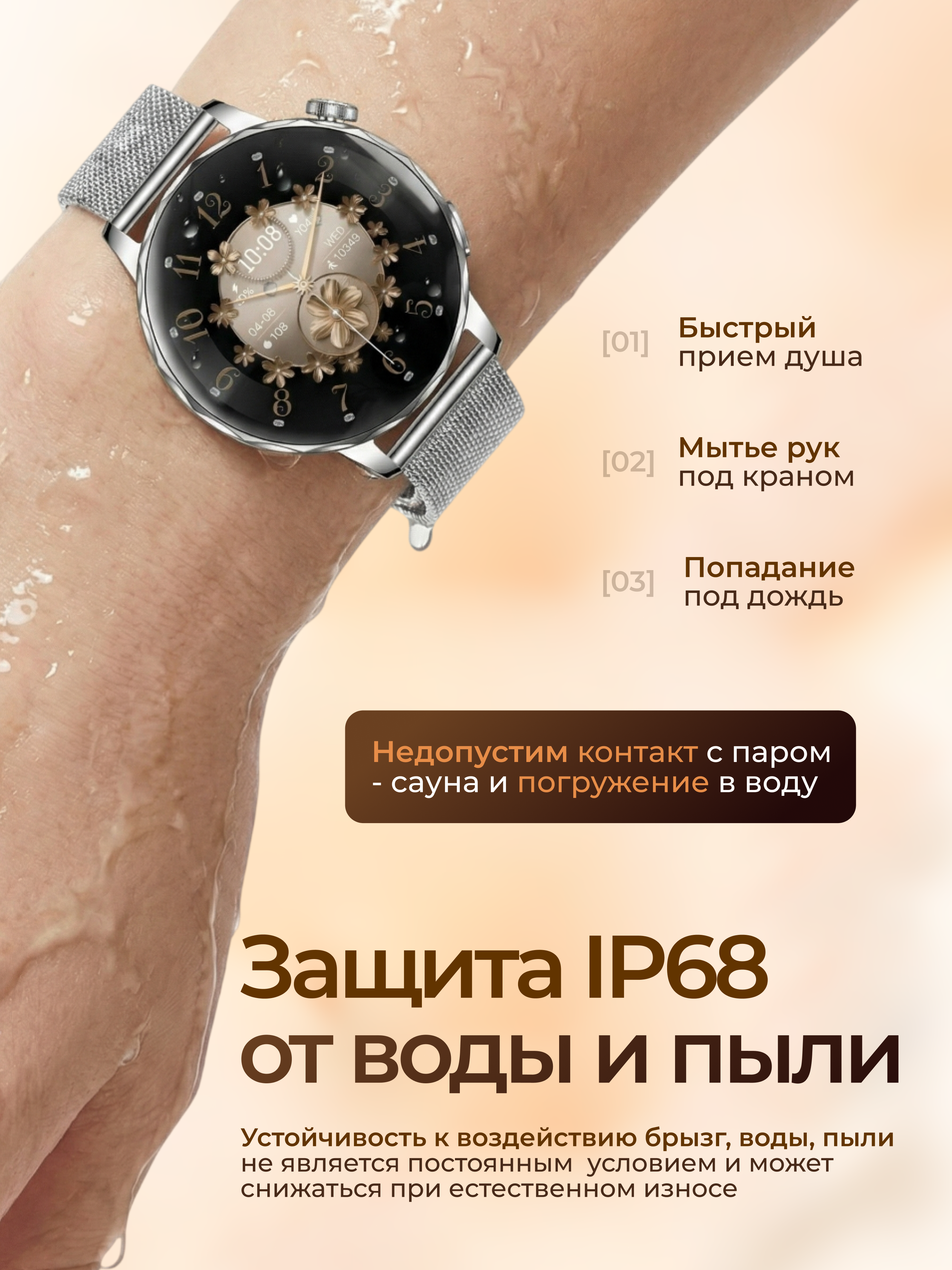Закаленное стекло дисплея устойчиво к механическому воздействию. Защита оболочки IP68 превращает сенсорные часы в пыле- и водонепроницаемый гаджет. Вид меню и циферблатов легко менять: в коллекции приложения более 100 видов обоев в разной стилистике.