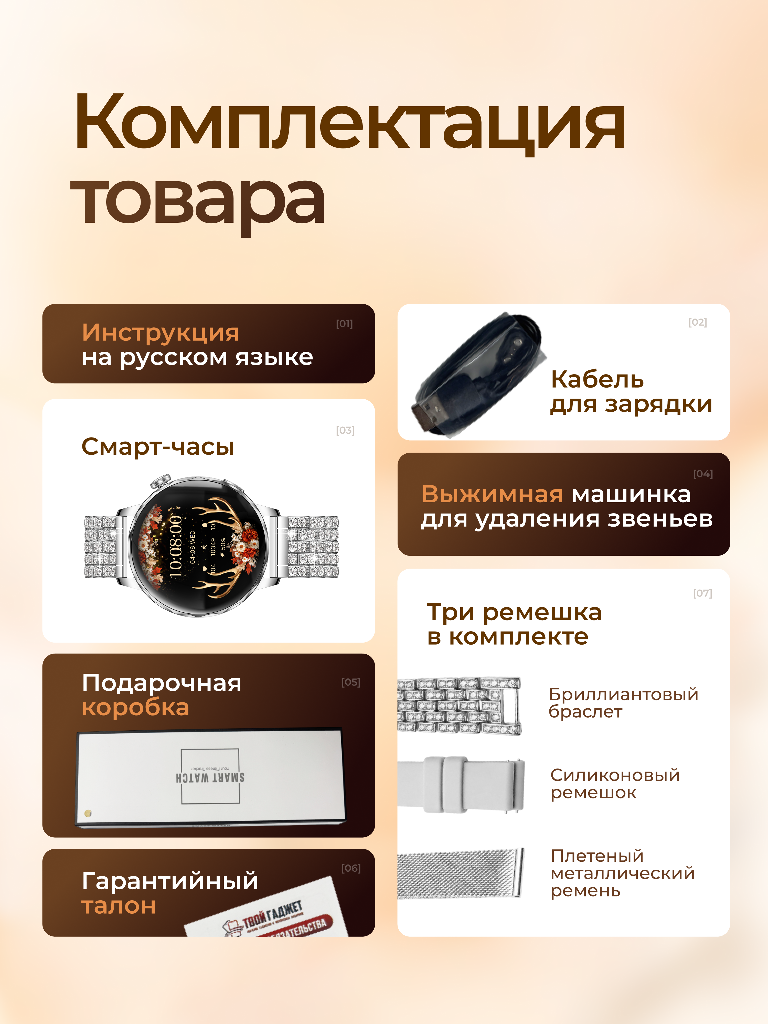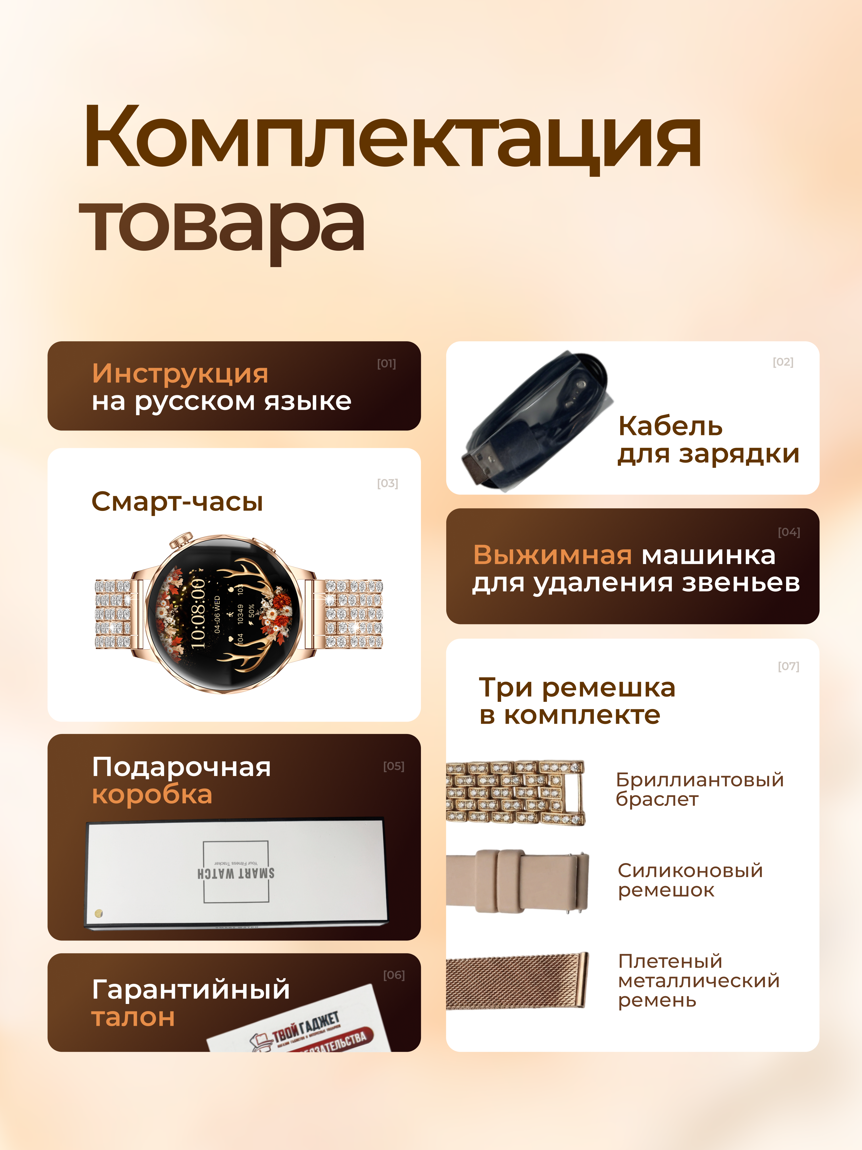 Оригинальный вариант подарка на день рождения или к 8 марта самым любимым. В комплект smart watch входят: подарочная коробка, гарантийный талон, зарядное устройство, три ремешка и съемник звеньев для регулировки браслета по обхвату руки.