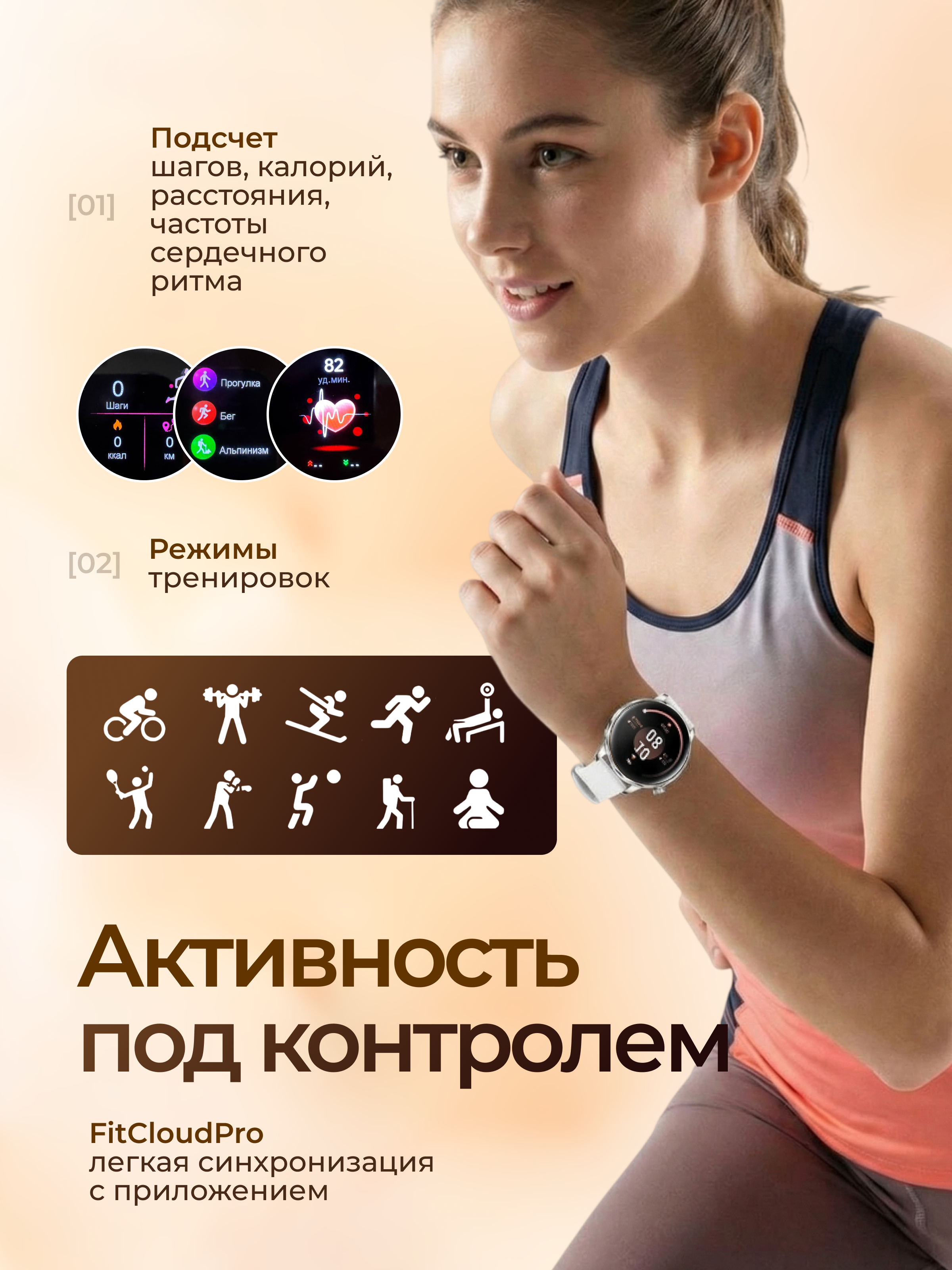 Отличная альтернатива фитнес трекеру на вашей тренировке. Смарт часы c шагомером проанализируют занятие на эффективность, произведут подсчет потраченных калорий, шагов, расстояний. Доступен полный список основных спортивных режимов - от йоги и кардио до силовых упражнений.